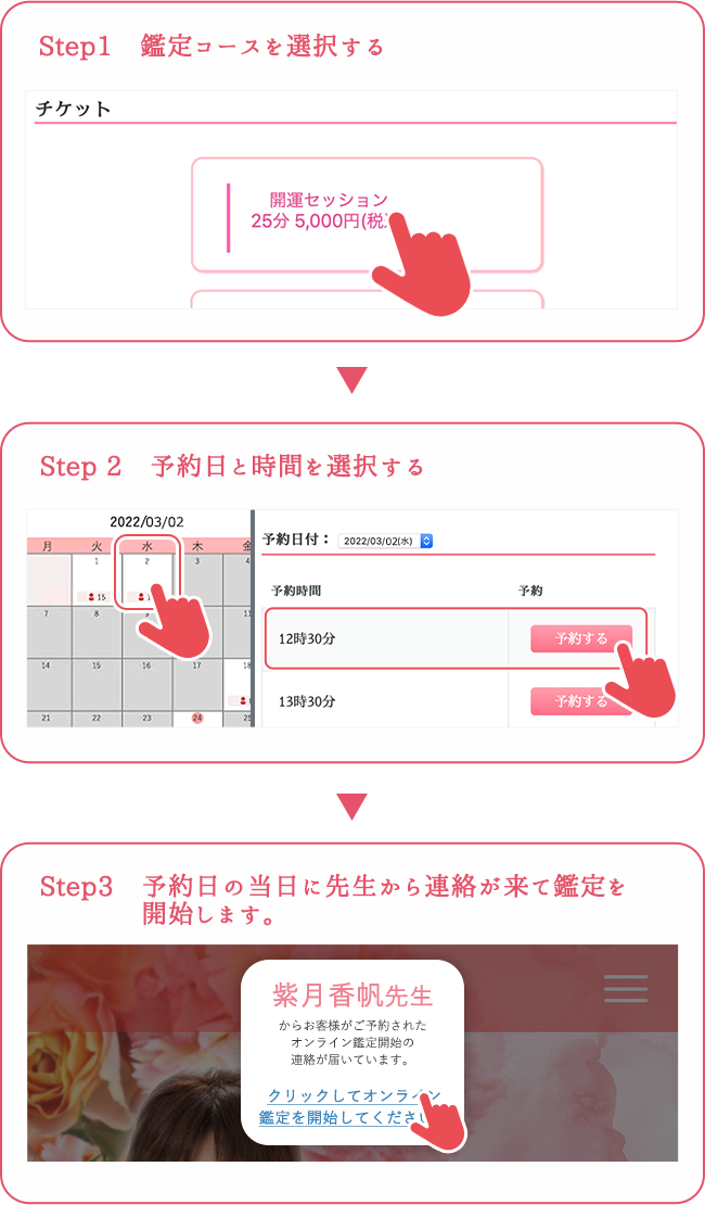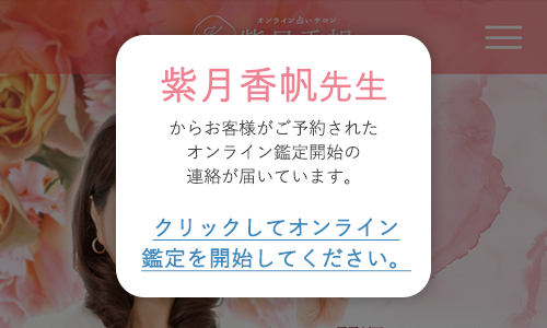 ご予約成立時に、ご予約完了メールを送信致します。 ご予約日前日にご予約確認のメールをお送りしますので、当日お時間になりましたらメールに記載されております、鑑定用URLをクリックしていただくと鑑定が開始されます。